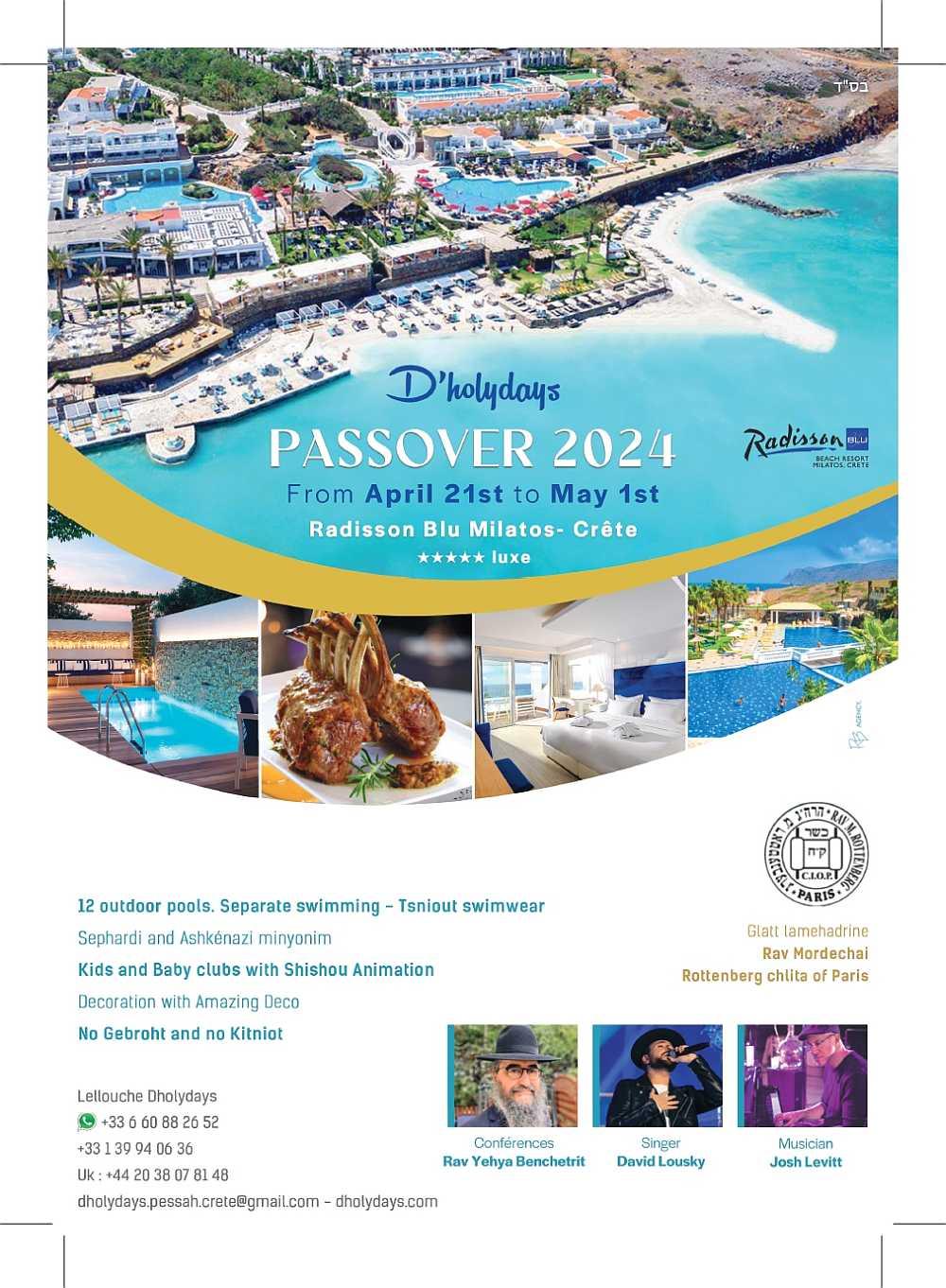 החג המיוחד יתקיים במלון RADISSON BLU MILATOS 5* בכרתים, מאורגן על ידי משפחת ללוש, שכבר יש להם ניסיון של למעלה מ-20 שנה בנופש כשר יוקרתי.