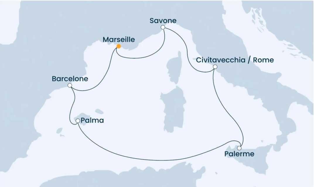 - צרפת, ספרד, איטליה. מרסיי, ברצלונה, פלמה דה מיורקה, סיציליה, רומא, סבון.