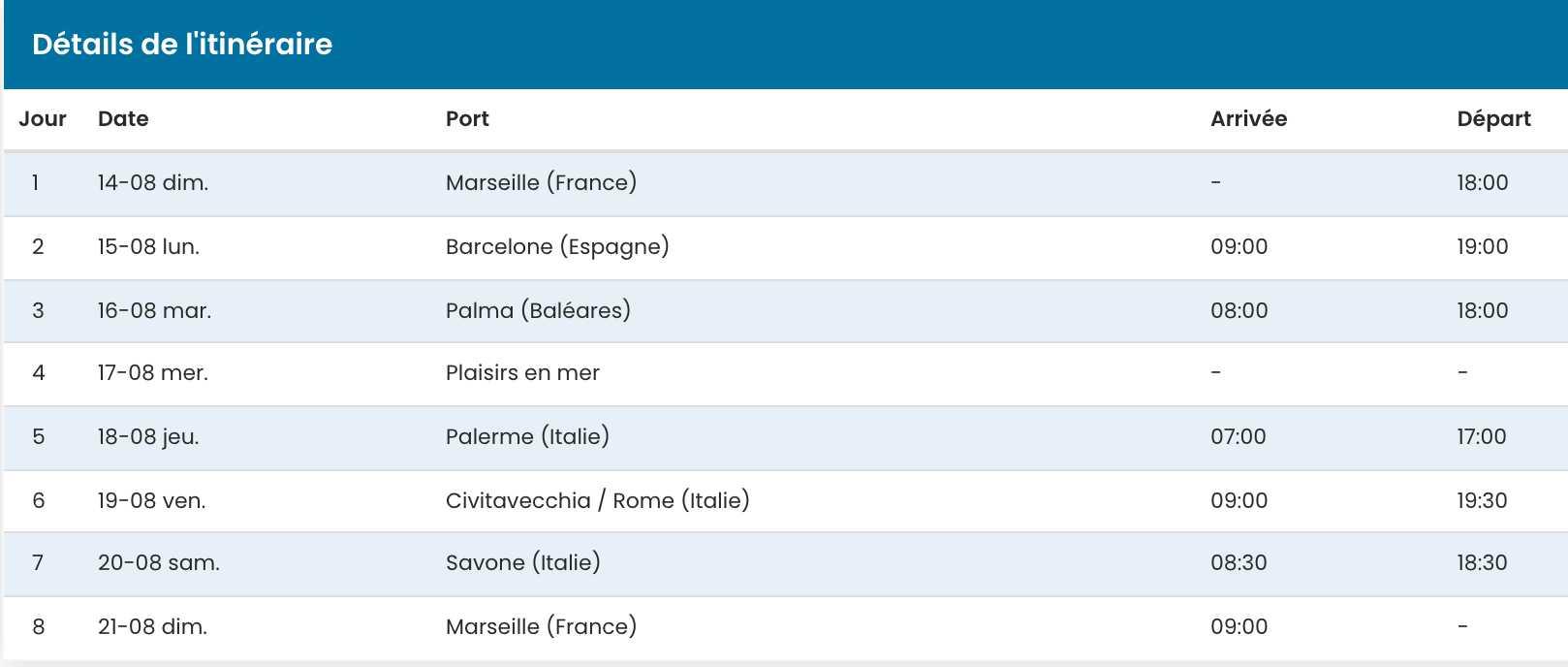 - יציאה ממרסיי ב-14 באוגוסט.